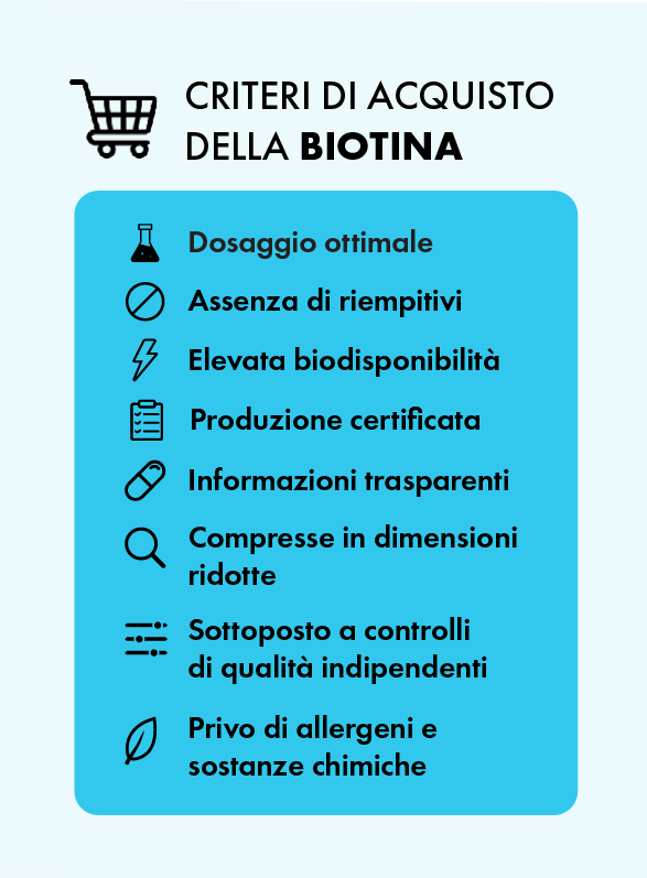 Se decidi di utilizzare un prodotto a base di biotina, esattamente come per qualsiasi altro integratore alimentare, assicurati che sia di alta qualità. Non scendere a compromessi: c’è in gioco il benessere del tuo organismo. Risparmiare sulla qualità è sicuramente la scelta sbagliata.